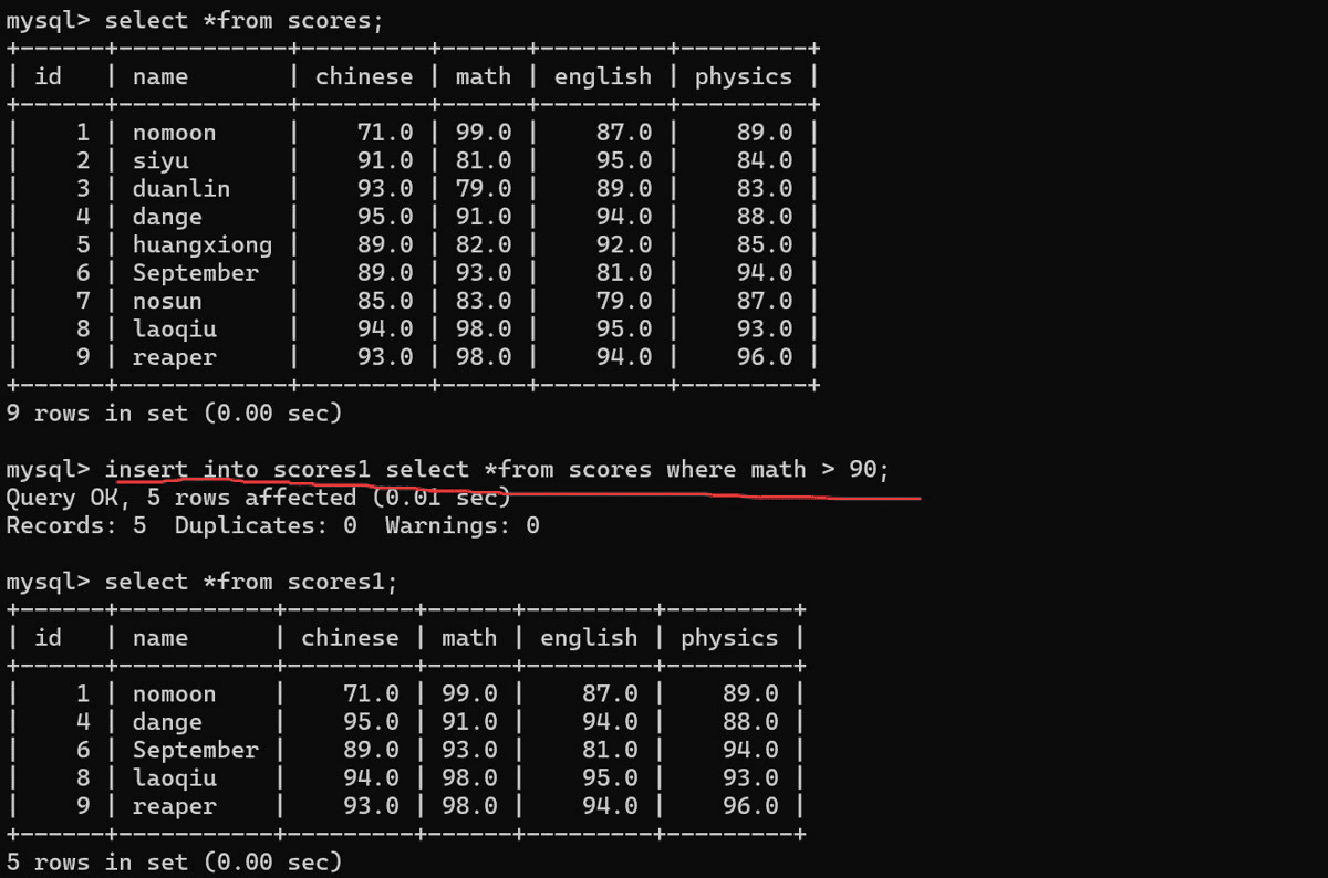 insert into 表1 select * from 表2 where (限制条件); 表1:被插入表 表2:提供数据表