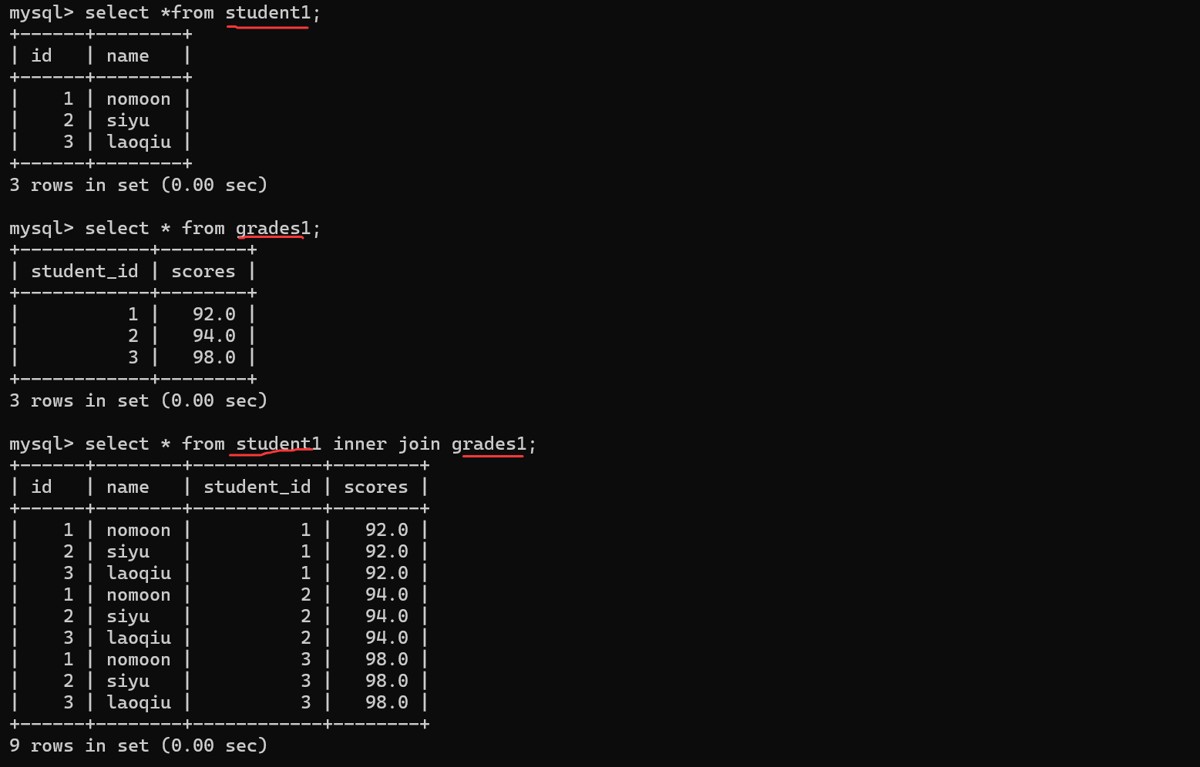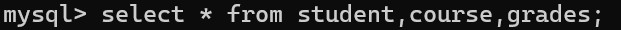 1.根据grades表可知,我们需要的数据分布在三个表中,因此我们要对三个表进行笛卡尔积
