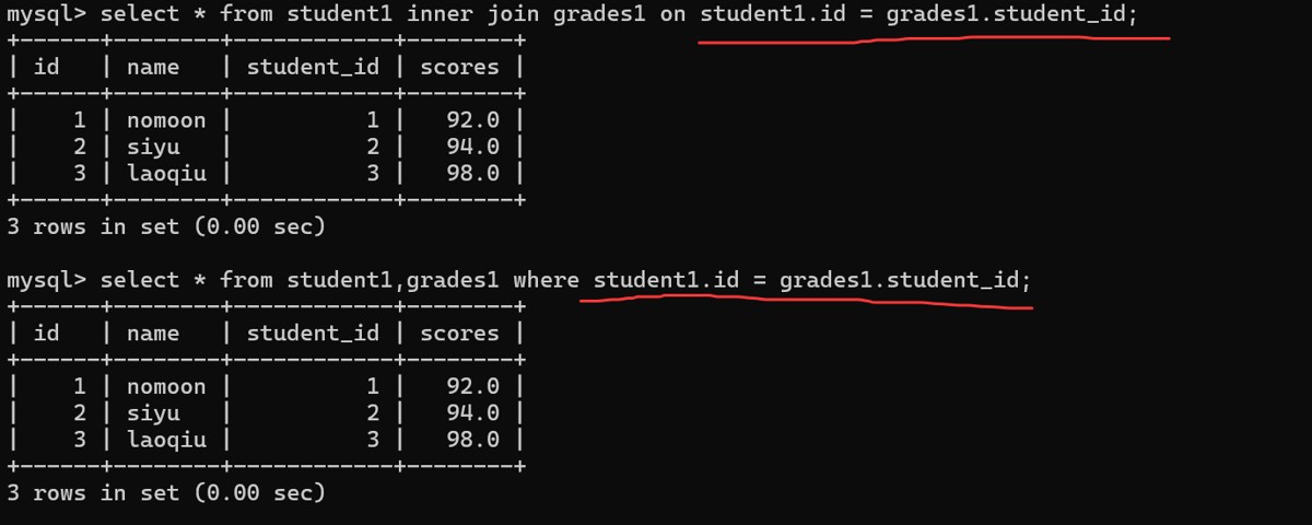 select * from 表1,表2 where (限制条件); select * from 表1 inner join 表2 on (限制条件);