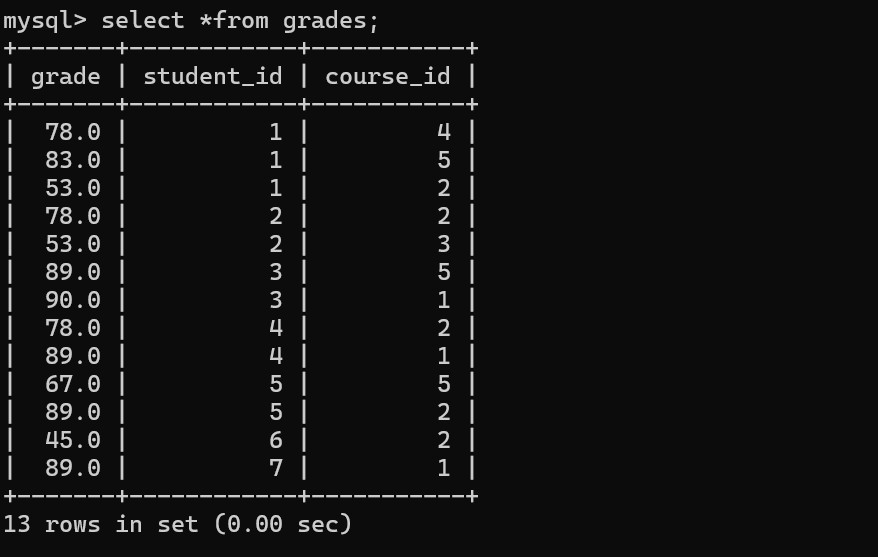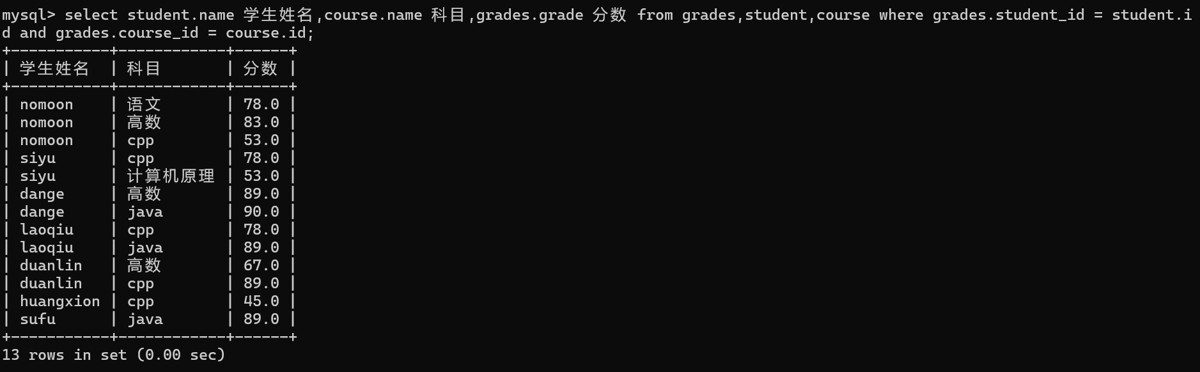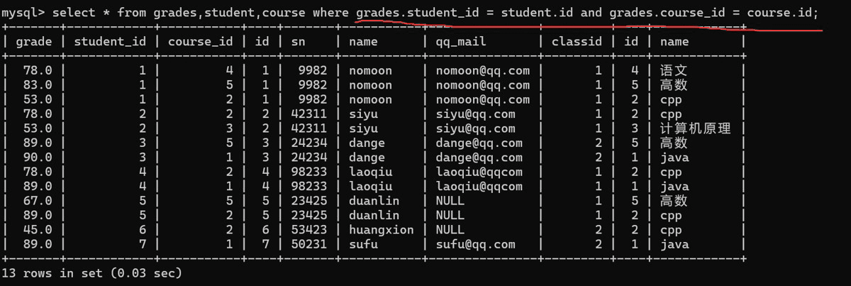 因此连接条件为grades.student_id = student.id and grades.course_id = course.id