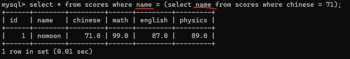 select * from 表名 where 列名 = (嵌套子句); 嵌套子句:select * from 表名 where (限制条件);