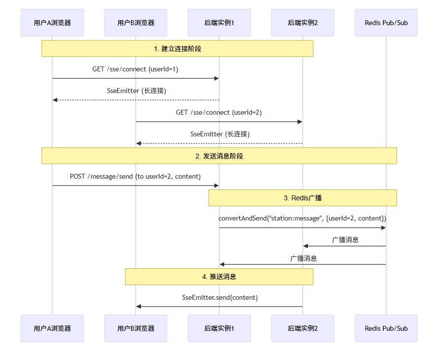 - 推送消息:实例2发现目标用户b在自己身上,通过sse连接将消息推送给b。实例1收到广播后也会检查,发现目标用户不在自己身上,则直接忽略。