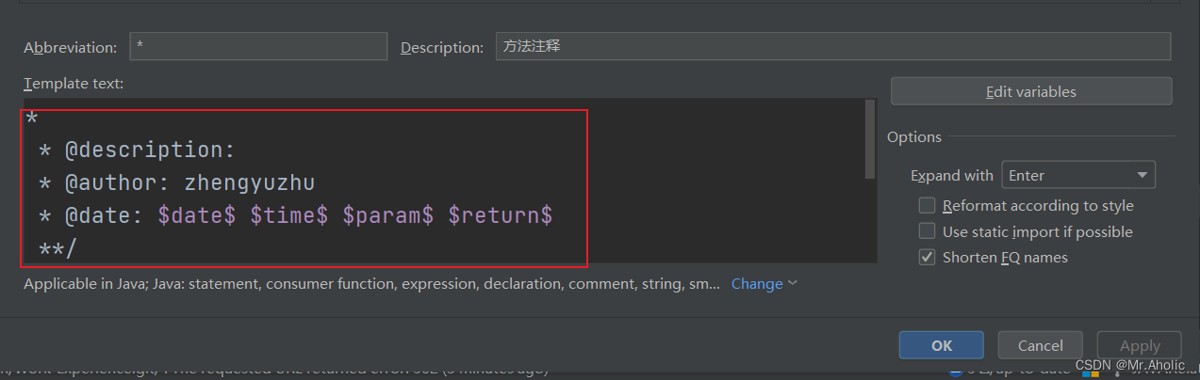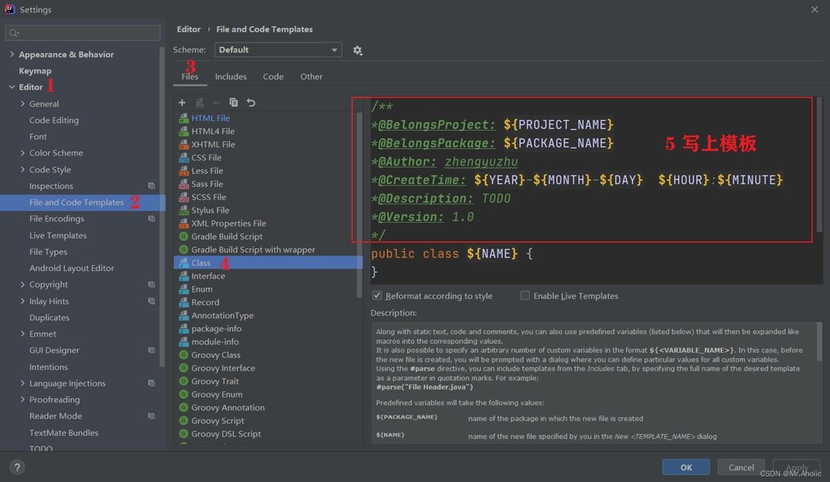 @belongsproject:项目名@belongspackage:当前包的名称@author:作者姓名@createtime:该类创建的时间@description:对该类的描述@version:设置版本号,一般新创建的类都是1.0版本,这里写死就可以了
