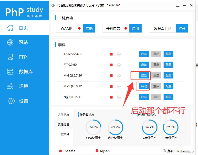 - 启动 phpstudy_pro,点击 mysql 的「启动」按钮,若弹出错误提示: