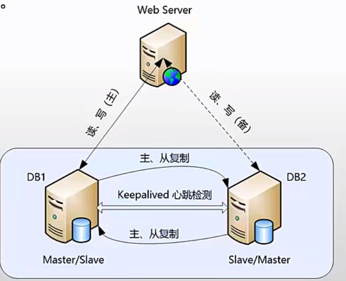 主要设计思路是通过mysql replication技术将两台mysql server互相将对方作为自己的master,自己又同时作为对方的slave来进行复制。这样就实现了高可用构架中的数据同步功能,同时,将采用keepalived来实现mysql的自动failovero在这个构架中,虽然两台mysql server互为主从,但同一时刻只有一个mysql server可读写,另一个mysql server只能进行读操作,这样可保证数据的一致性。