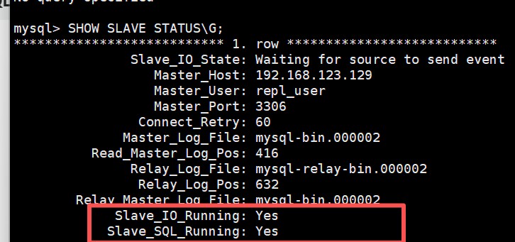 change replication source to source_host = '192.168.123.129', #主节点配置ip source_user = 'repl_user', #主节点创建的用户 source_password = 'fe216474@', #主节点创建的密码 source_auto_position = 1;