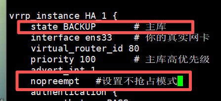 - keepalive.conf配置文件都改为backup,然后加上nopreempt