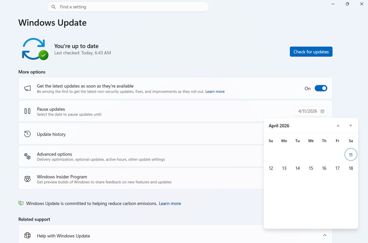 除了跳过更新,微软正在测试更精细的更新控制功能。新的日历视图允许用户根据需求暂停更新,虽然该功能目前在预览版中仍不稳定,但预计将在未来几周内推送。