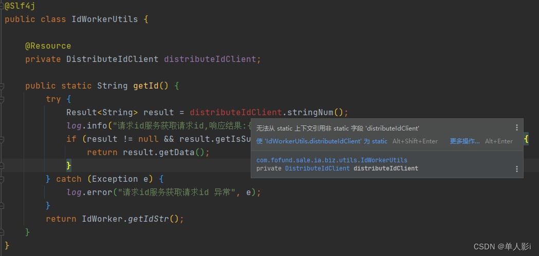 - 静态方法里边引用了非静态变量 distributeidclient,这个会直接报错的