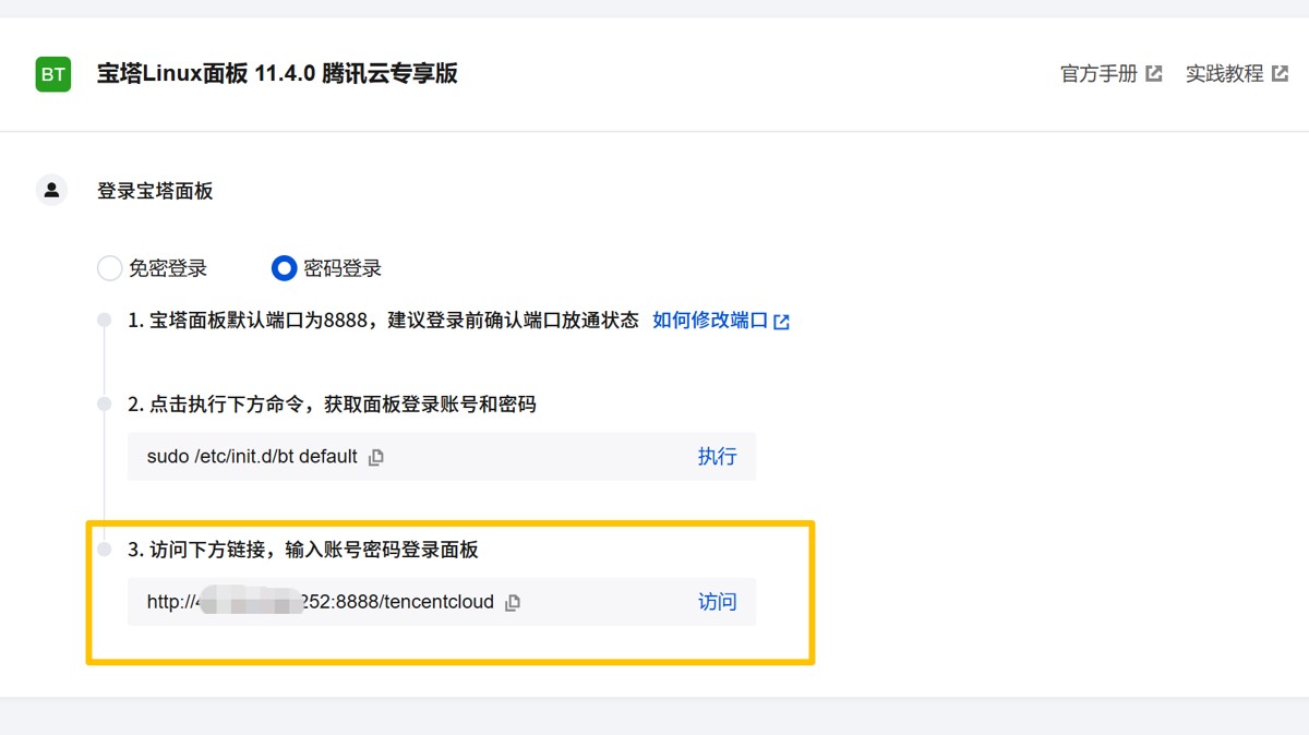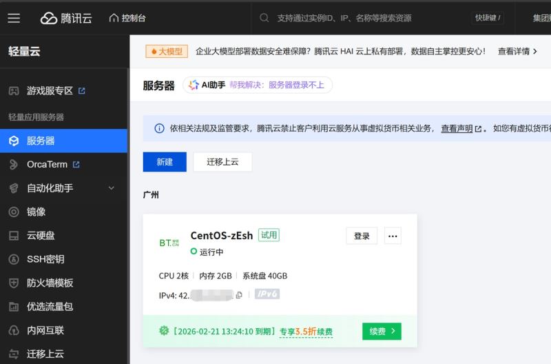 我们可以安装宝塔linux,也可以选择使用腾讯云服务器自带的宝塔linux。【这里我使用服务器自带的】