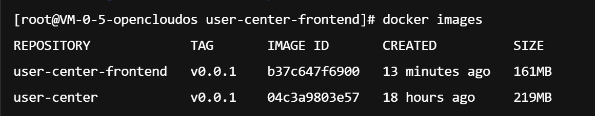 前端:前端的dockerfile和nginx.conf,这些也是需要上传到git仓库里,然后clone过去就行,构建镜像命令:先进入上传的前端项目目录中cd user-center-frontend,再构建docker build -t user-center-frontend:v0.0.1 .(跟后端的操作都大差不差)
