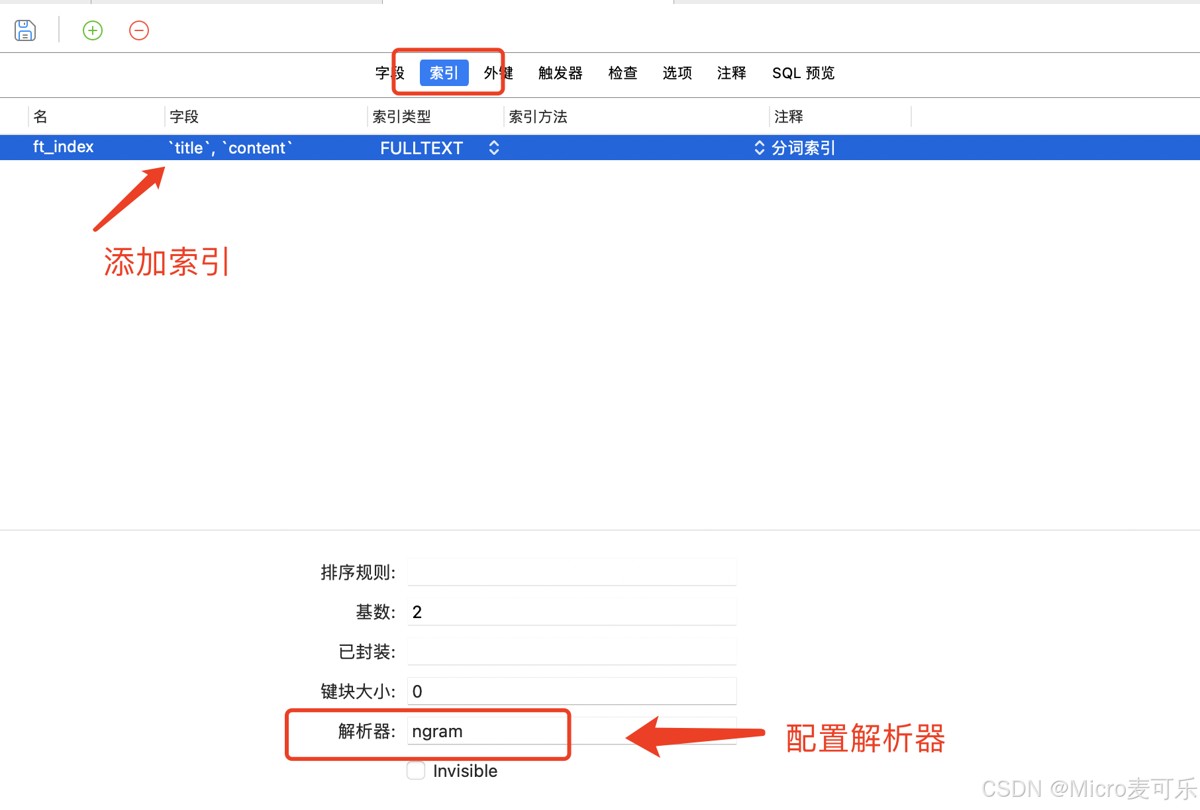 alter table articles add fulltext index ft_index (title, content) with parser ngram; -- 中文需指定ngram解析器