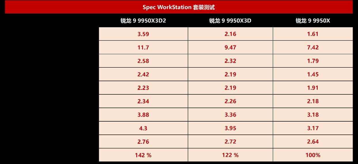 最后简单总结一下。从amd官方定位来看,在zen5 x3d家族中,锐龙7 9850x3d是“全球最佳游戏处理器”,锐龙9 9950x3d是“全球最佳内容创作者&游戏玩家处理器”,而具备双倍3d v-cahce缓存的锐龙9 9950x3d2 dual edition则是“为开发者与创作者打造的低延迟超级游戏处理器”。从这个命名可以看到,具备双倍3d v-cahce缓存的锐龙9 9950x3d2 dual edition升级针对的用户群就是专业开发者、创作者和顶级游戏玩家。从前面的测试可以看到,在高负载渲染、仿真等专业应用中,双倍3d v-cahce缓存带来了巨大的效率提升,例如在spec workstation测试中,锐龙9 9950x3d2 dual edition相对锐龙9 9950x的效率提升幅度最高可达123%,平均提升可达42%,相对锐龙9 9950x3d也有16%提升,可以说非常夸张,完全对得起官方定义的“超级处理器”称号。坦白来讲,目前在专业生产力方面,锐龙9 9950x3d2 dual edition堪称最强霸主,是专业用户不二之选。