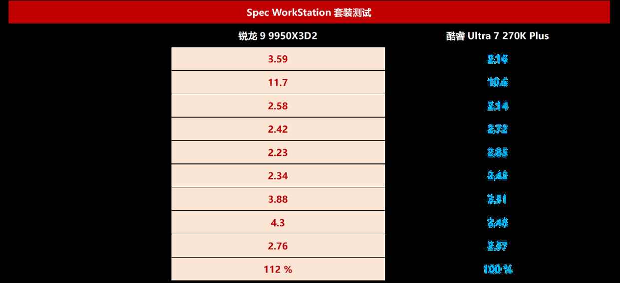 如果和目前intel阵营实际上最强的酷睿ultra 7 270k plus对比,锐龙9 9950x3d2 dual edition在spec workstation测试套件中的优势也是明显的。特别是在poisson二维泊松方程求解项目中,领先幅度高达66%。综合全部项目来看,锐龙9 9950x3d2 dual edition平均领先酷睿ultra 7 270k plus的幅度也达到了12%,高出一个级别。
