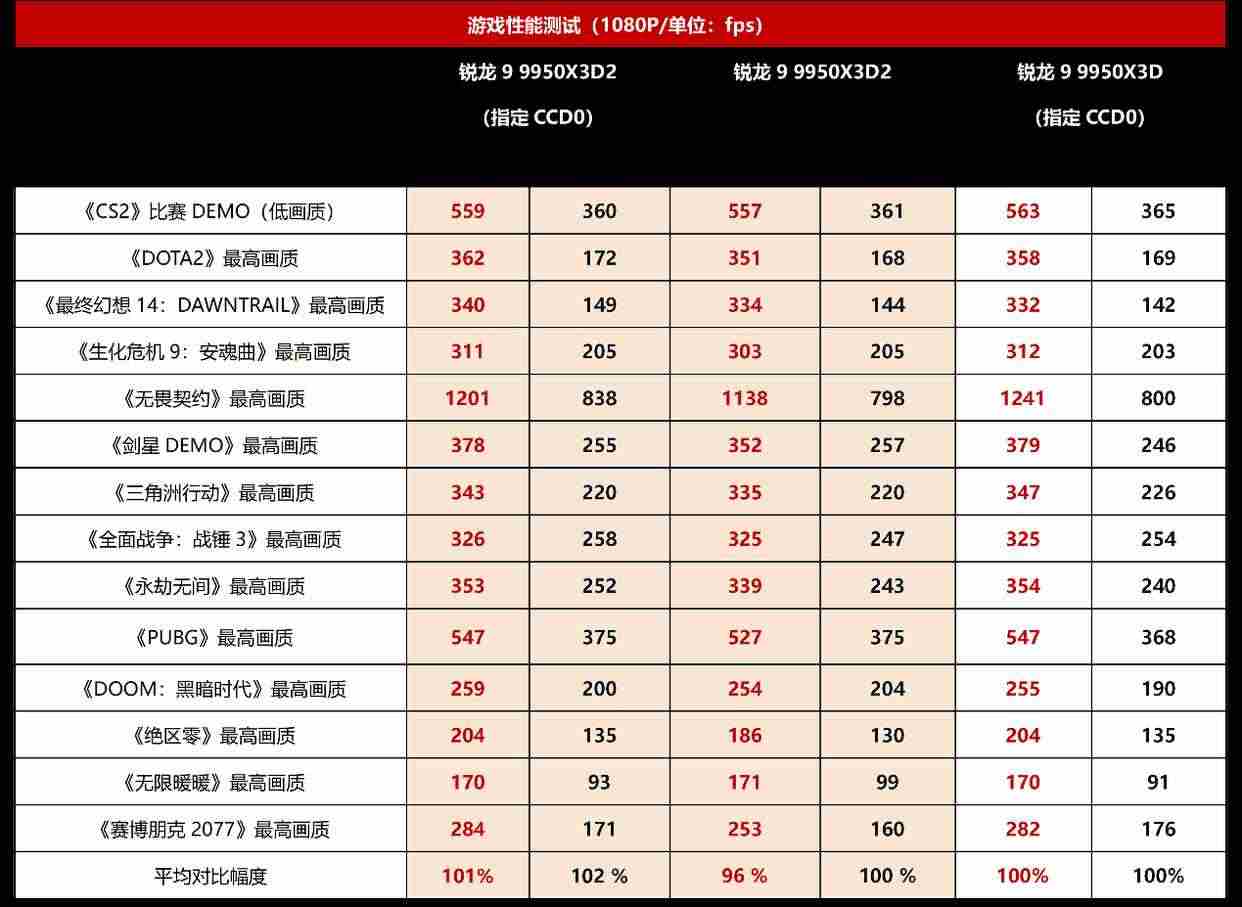 此外,从我们的测试来看,锐龙9 9950x3d2 dual edition由于在两个ccd上都加装了3d v-cache缓存,默认设置下,一些游戏进程也会出现跨ccd调用核心的情况,在一定程度上增加了核间延迟,因此游戏帧率相对指定大缓存ccd0的锐龙9 9950x3d来讲可能会有“误差级”的小幅降低。不过在同样指定ccd0后可以得到解决,综合表现甚至还有1%的优势。因此,我们建议游戏玩家在使用锐龙9 9950x3d2 dual edition的时候,可以考虑和锐龙9 9950x3d一样开启主板自带的x3d turbo mode/game mode,使用ccd0运行游戏,从而获得最佳的游戏帧率表现。