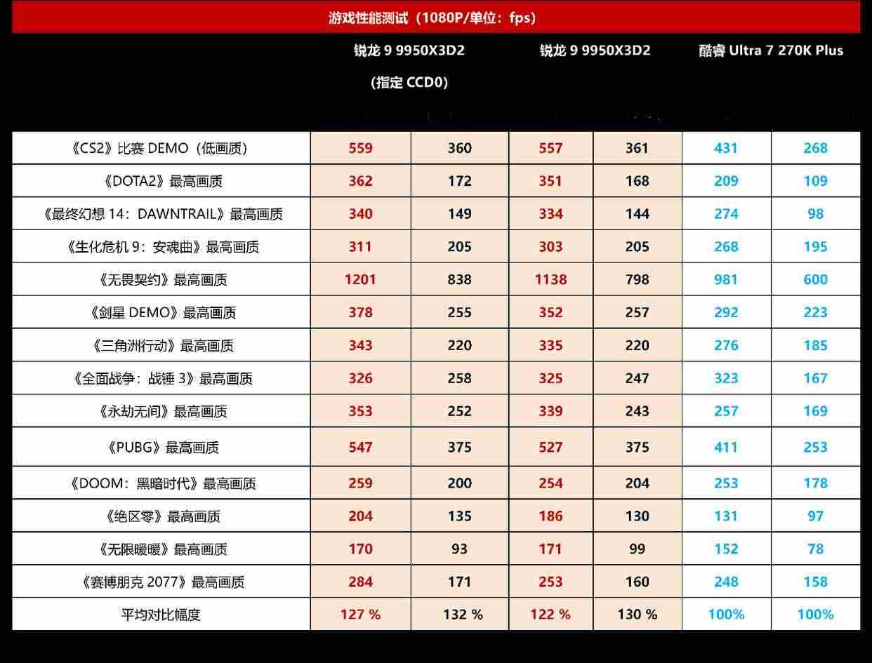 游戏性能方面,酷睿ultra 7 270k plus只能是单方面被碾压,即便它已经相对酷睿ultra 9 285k大幅提升了游戏性能,也和锐龙9 9950x3d2 dual edition完全不是一个档次的存在。在双ccd默认设置下,锐龙9 9950x3d2 dual edition平均帧领先酷睿ultra 7 270k plus大约22%,1% low帧领先30%,而在单ccd设置下,平均帧和1% low帧领先的幅度来到了27%和32%,已经属于领先两代的水准,可见锐龙9 9950x3d2 dual edition玩家首选、游戏霸主的地位毋庸置疑。