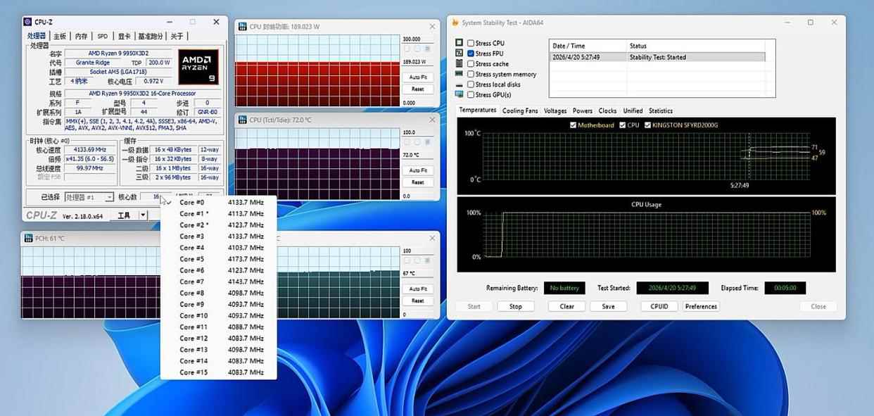 首先是在默认tdp设置下,使用aida64单考fpu,可以看到锐龙9 9950x3d2 dual edition封装功率大约在190w左右,全核频率大约在4.1ghz上下(两个ccd频率稍有差异),此时处理器满载温度仅有72℃,可以说温度控制还是不错的。