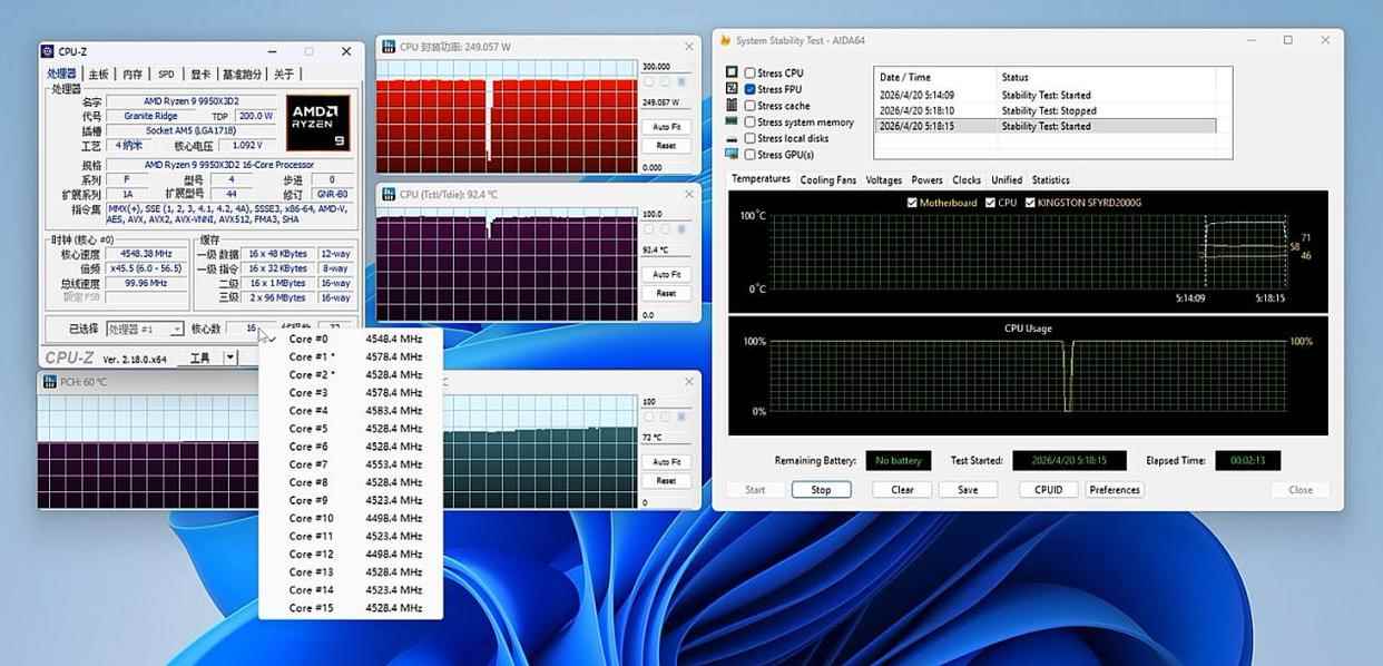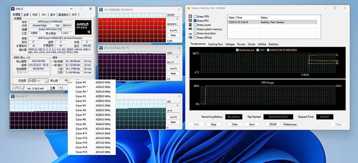 完全解锁功率限制后,aida64单考fpu封装功率来到了250w左右,全核频率也来到了4.3ghz上下,满载温度达到93.1℃。