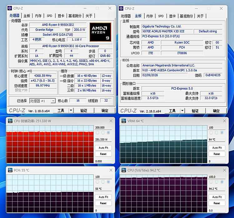 此外,我们也可以看到在满载250w考机状态下,技嘉x870e aorus master x3d ice超级冰雕的vrm温度为64℃,可见其供电电路用料、epic vrm散热装甲的散热效果都很出色,完完全能轻松搞定火力全开的锐龙9 9950x3d2 dual edition。