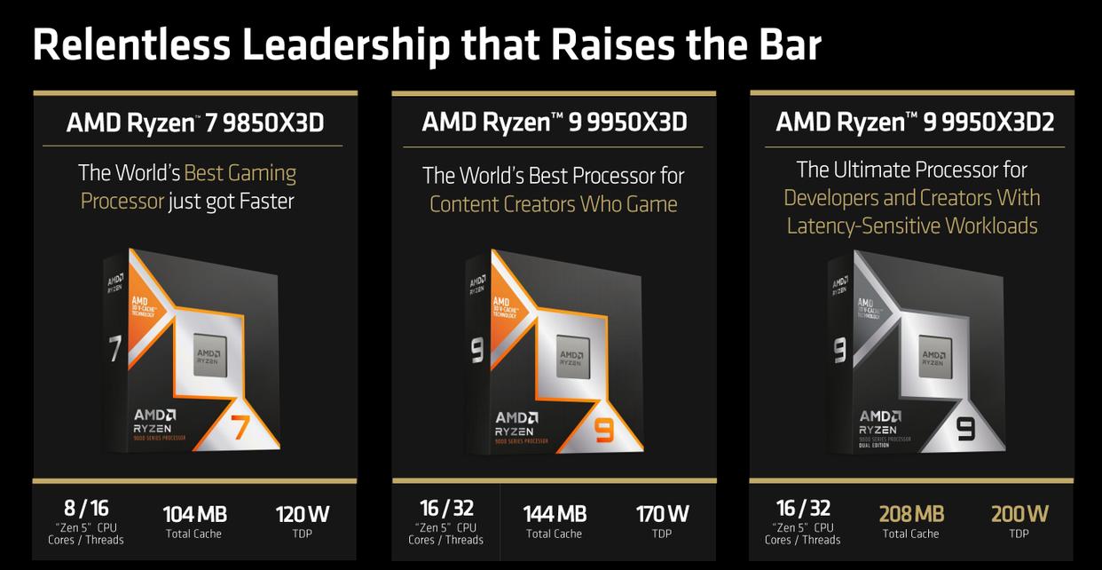 从amd官方介绍来看,锐龙9 9950x3d2 dual edition在游戏性能方面与锐龙9 9950x3d持平。可能有玩家会不解,为什么加了64mb 3d v-cache缓存对游戏性能的提升会不明显呢?实际上目前的游戏大作对处理器的资源专用很少会超过8核16线程,这就意味着游戏进程在锐龙9 9950x3d2 dual edition、锐龙9 9950x3d、甚至是锐龙7 9850x3d上都只能享受一个ccd上的3d v-cache缓存增益,效果自然没有太大区别。不过要是未来的游戏大作使用到了更多的核心,那么同时具备双ccd和双倍3d v-cache缓存的锐龙9 9950x3d2 dual edition优势就会显现出来了,从这一点来看,锐龙9 9950x3d2 dual edition的双倍3d v-cache缓存设计更具“战未来”的长远考虑。