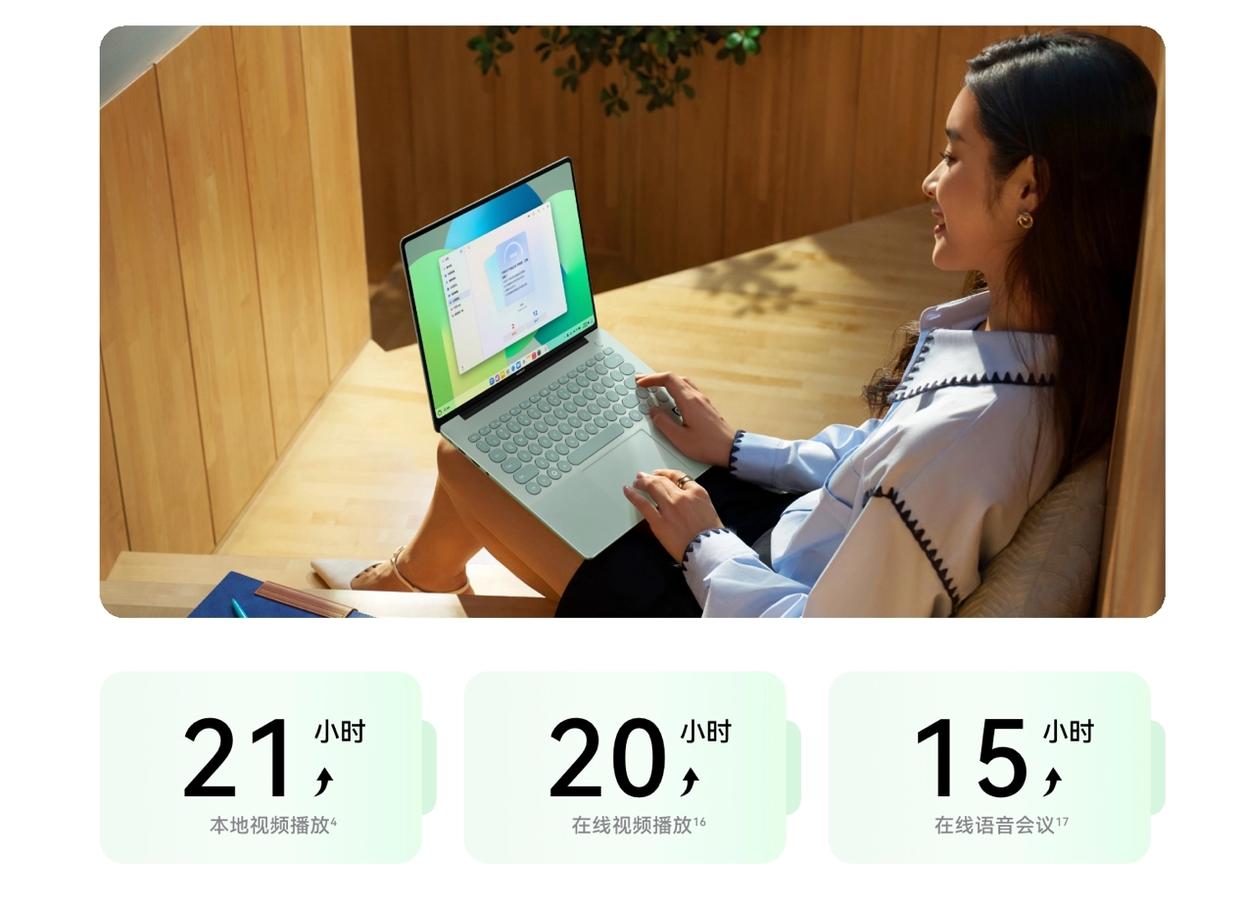 还有续航,华为 matebook 14 鸿蒙版拥有 70wh 的大容量电池,本地 1080p 视频播放能撑 21 小时,追一天剧都没问题;爱奇艺视频播放 20 小时,通勤路上再也不怕无聊;就连高强度的腾讯语音会议也能坚持 15 小时。