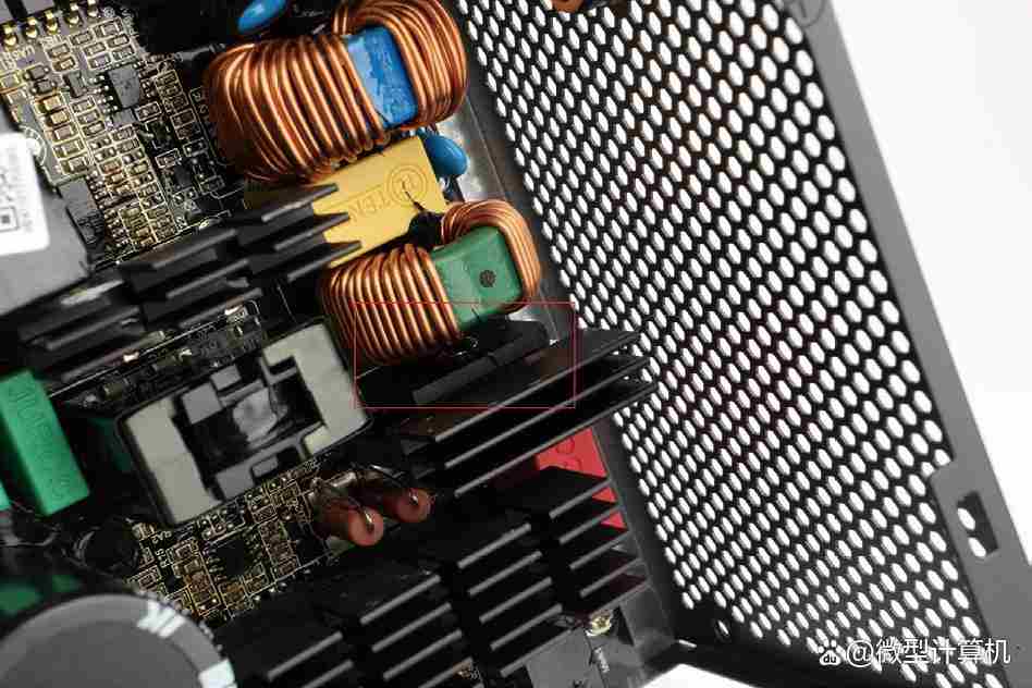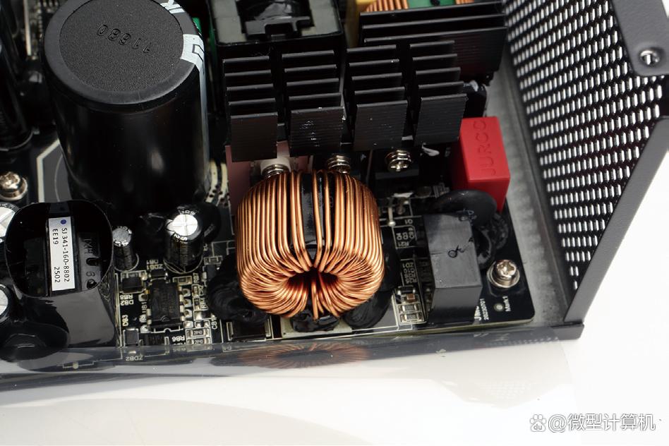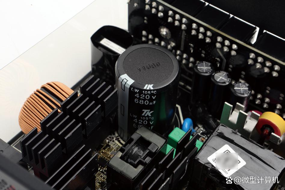 在pfc电路旁,超频三战锤kn850配置了来自日系tk(东信)的主电容—420 v/680 μf。折算每瓦电容量达0.8 μf,高于业界很多普通电源采用的0.5 μf/w基准值,用料很有诚意。该电容可耐105 ℃高温,具备出色的纹波抑制能力,其总容量冗余设计更确保了电源在极端负载下的稳定输出。同时,配合其超长寿命,为电源长时间高负荷运行提供了可靠的供电保障。