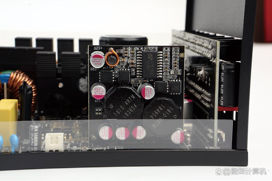 主变压器旁最外侧的是电源的dc to dc子板,负责+5 v和+3.3 v电压转换。该子板上配备有2个功率电感,每个电感旁各配置2个、总计4个dc转换器,丝印型号为“4024gemt”,来自apec(富鼎)。它可耐压30 v,导通阻抗4.5 mω。另外,该子板还板载了anpec(茂达电子)apw7159c控制器。此外,在风扇接口的旁边,该电源还配置了一个来自grenergy(南京绿芯)的“gr8313”保护ic。它可实时监测+3.3 v、+5 v和+12 v输出电压,具备过压保护(ovp)、欠压保护(uvp)与power good信号生成3大核心功能:当任一电压超出正常工作阈值时,该ic会触发保护机制并锁定电源;在电源就绪或关机时,该ic会生成开漏输出的power good信号,向整机系统发出通知。同时,配合内置的延迟与去抖机制,为整机提供可靠的供电安全保护。