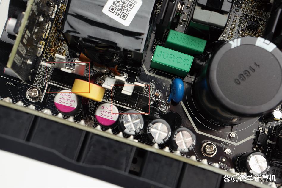 超频三战锤kn850搭载了pq32磁芯主变压器,作为电源能量转换的核心部件,其与二级emi滤波电路之间通过裸pcb区域搭建起电磁隔离带,能有效阻断高频干扰信号的传导,保障能量转换过程的信号纯净度。主变压器的背面布局着电源的+12 v同步整流电路,该电路上配置有3个整流管与3个续流管。这类功率器件均来自美浦森,丝印型号为“slm160n04g”,器件耐压值达40 v,导通阻抗仅1.1 mω,低阻抗特性可有效减少导通损耗,提升电源整体转换效率。而这款电源的同步整流控制ic则选用芯源出品的“mp6924a”,为+12 v同步整流电路提供驱动与调控,保障整流环节高效、稳定运行。