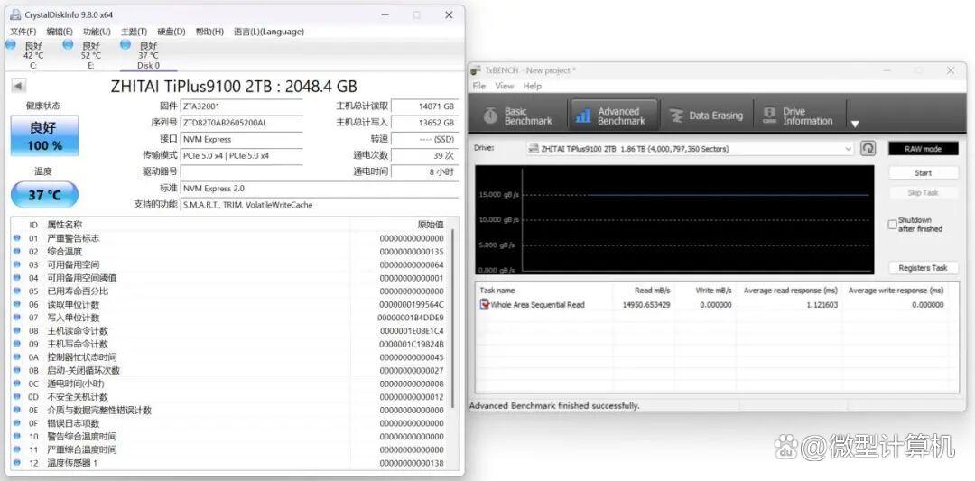▲致态tiplus9100 pcie 5.0固态硬盘2tb的全盘平均顺序读取速度可达14950.65mb/s,读取完2tb数据时的温度仅37℃。