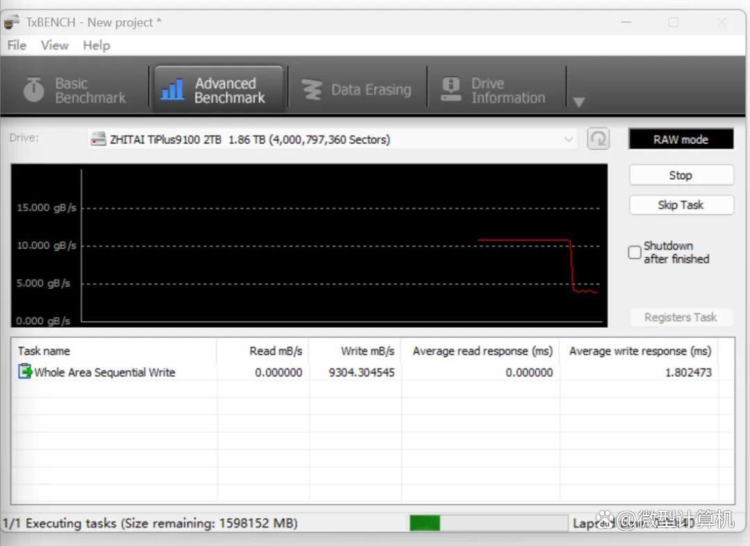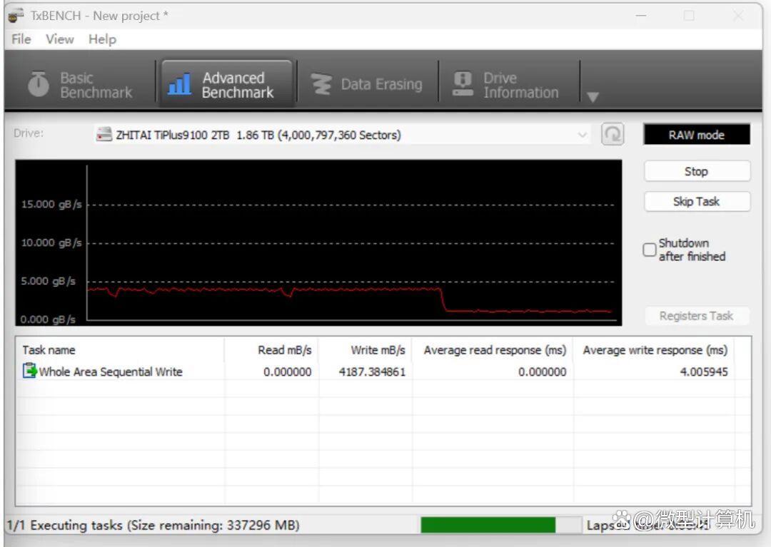 鉴于基准测试往往只使用1gb数据量进行测试,不能反映固态硬盘写入大容量数据的真实表现,因此我们还使用txbench进行了全盘读写测试。首先在全盘顺序读取测试中,ssd轻松地完成了任务,全盘平均顺序读取速度高达14950.65mb/s,远超标称规格。全盘顺序写入测试中,我们发现致态tiplus9100 pcie 5.0固态硬盘2tb的slc缓存容量较大,slc固定容量缓存设置在313gb左右。在这个容量范围内写入,其写入速度能保持在10700mb/s~11000mb/s,超出这个容量范围后才会出现掉速。