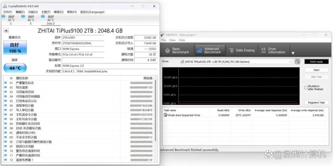 ▲致态tiplus9100 pcie 5.0固态硬盘2tb的全盘平均顺序写入可达2973.16mb/s,写入2tb数据后的温度仅44℃。