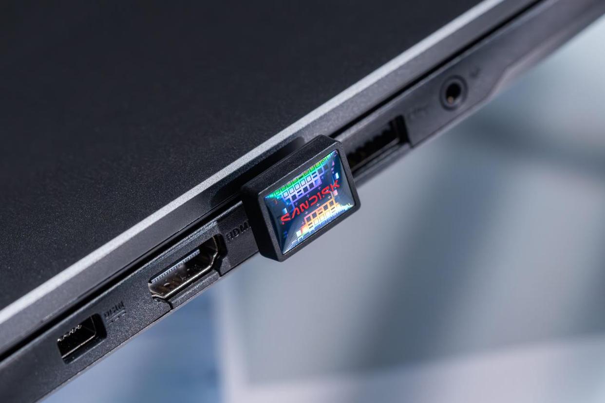 此次体验,我们搭配了华硕天选 air 2026 款轻薄本(标配 32gb 内存 + 1tb 内置固态硬盘)做为核心设备,将闪迪至尊极速小神盾闪存盘插在轻薄本的type-c接口,可以看到它能够轻松跟机身融合到一起,不管是开着盖还是合上盖子,都很贴合。这样一来,闪迪至尊极速小神盾闪存盘就可以跟我们平时使用无线键鼠的接收器一样,“长”在笔记本上,实现扩容的同时丝毫不会增加额外的负担。