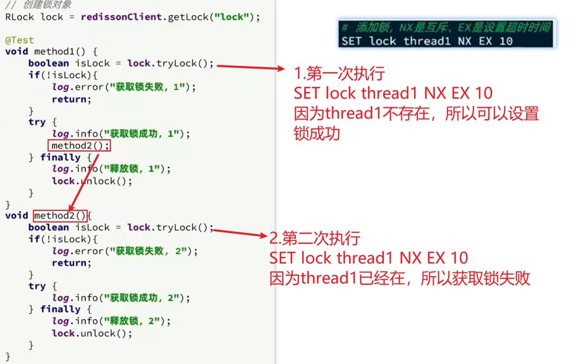 对应到程序里,再简单说一句:你写了两个方法a和b,两个方法都需要同一把锁(相当于都需要用1号机),方法a里会调用方法b(相当于用1号机时,中途要做另一个需要用1号机的操作)。用redisson可重入锁,程序执行a、再调用b时,能直接执行,不卡顿;用不可重入锁,程序会卡在b那里,自己等自己释放锁,永远等不到,直接卡死。