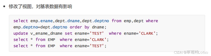 -- 修改视图中的员工姓名 update v_ename_dname set ename='test' where ename='clark'; -- 查询基表,数据已被同步修改 select * from emp where ename='clark'; select * from emp where ename='test';