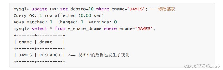 -- 修改基表中员工的部门编号 update emp set deptno=10 where ename='james'; -- 查询视图,部门名称已同步更新 select * from v_ename_dname where ename='james';