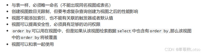 - 排序覆盖规则:视图定义中可以使用 order by,但如果从该视图查询的 select 语句中也包含 order by,视图中的排序会被外部的排序覆盖;