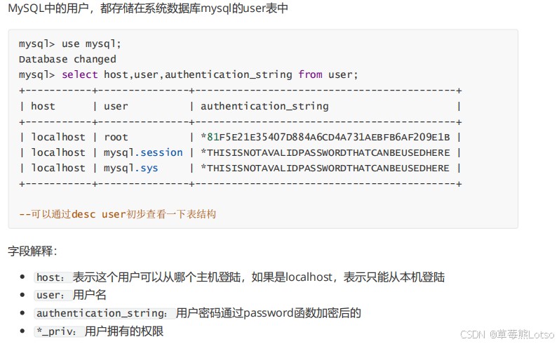-- 切换到mysql系统库 use mysql; -- 查询核心用户信息 select host, user, authentication_string from user;