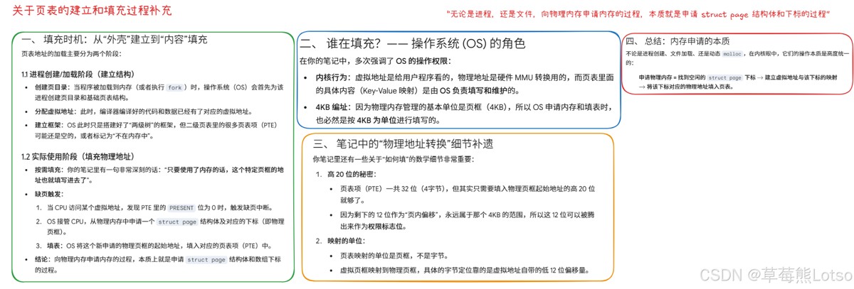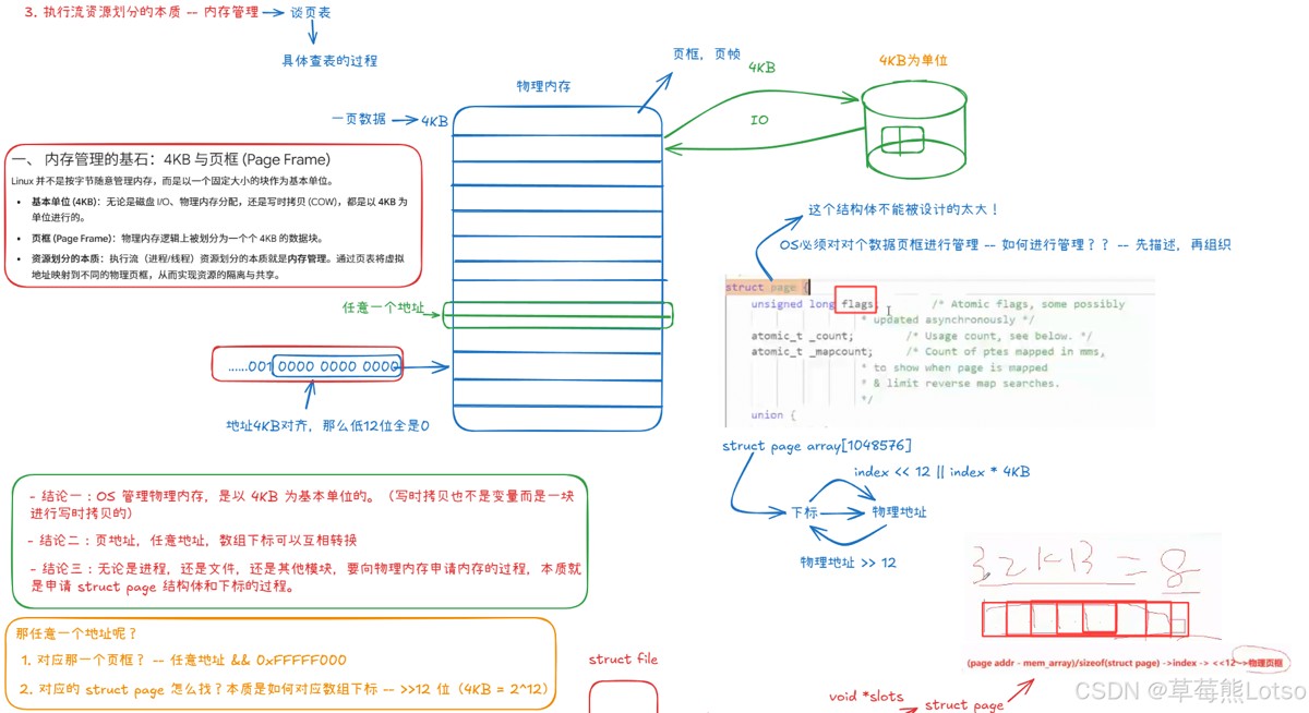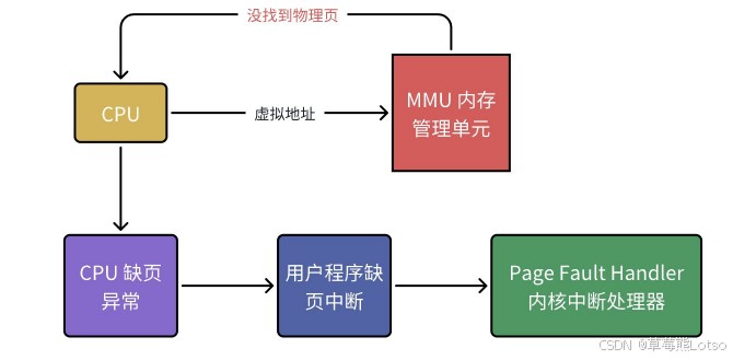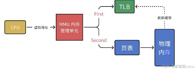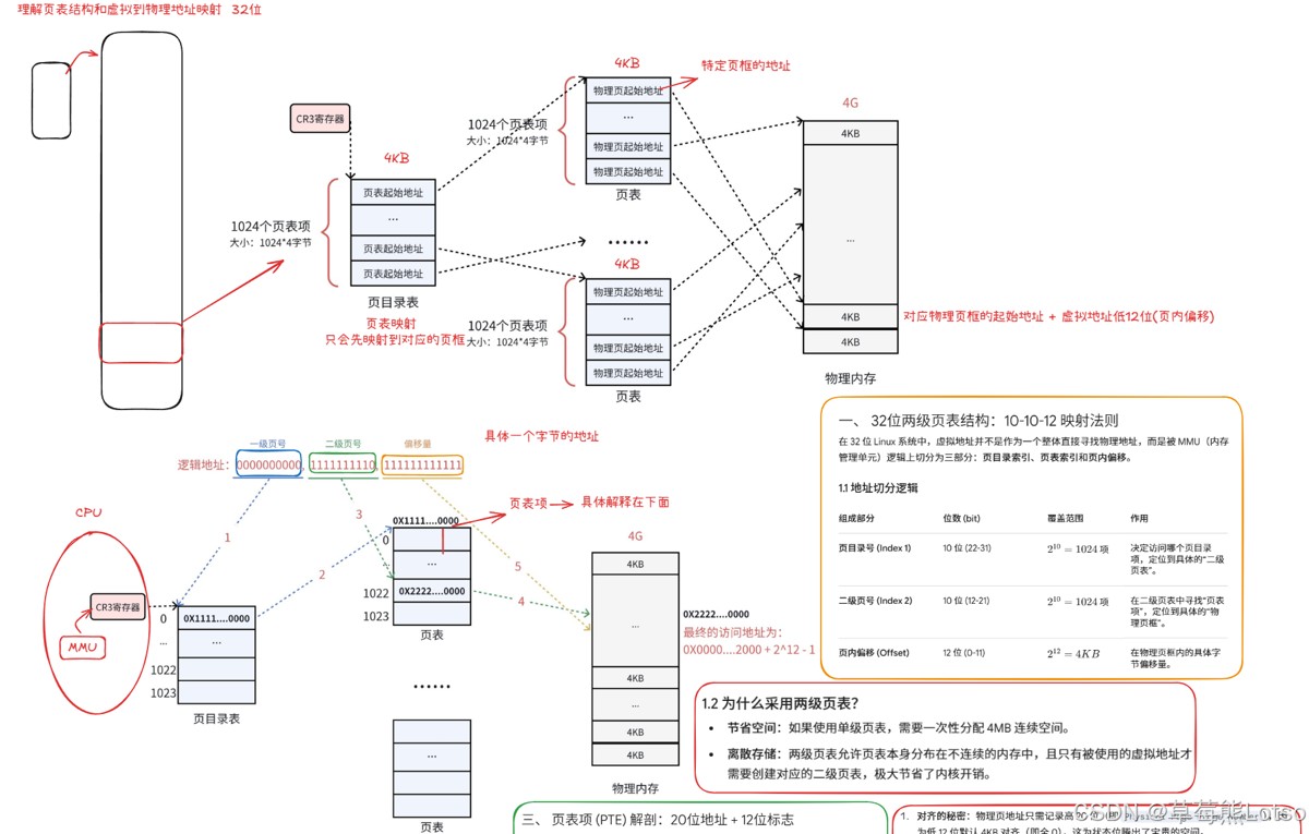 - 作用:把连续的虚拟地址,映射到不连续的物理内存页,解决内存碎片问题。