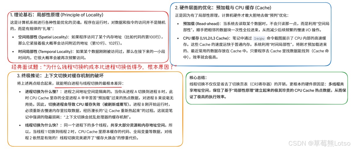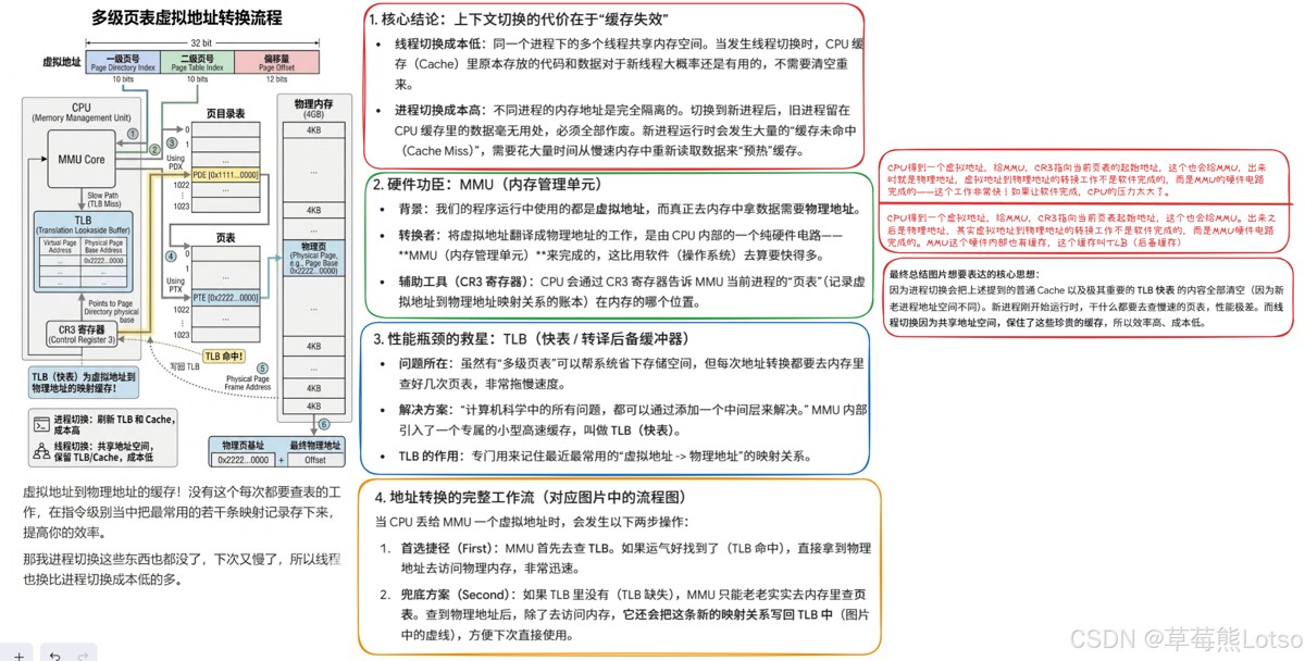 tlb(快表)会被全部刷新,这将导致内存的访问在一段时间相当的低效。但是在线程的切换中,不会出现这个问题,当然还有硬件cache。