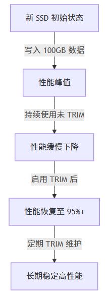 从图中可见,trim 对维持 ssd 长期性能至关重要。没有 trim,ssd 会在使用几个月后出现明显的写入降速。