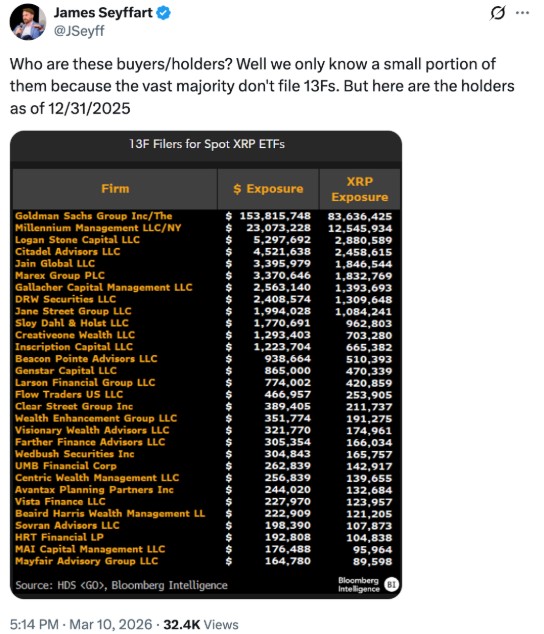 高盛集团并非独行。据彭博高级etf分析师james seyffart表示,其配置约占前30大机构投资者所持有约2.11亿美元xrp etf的73%。