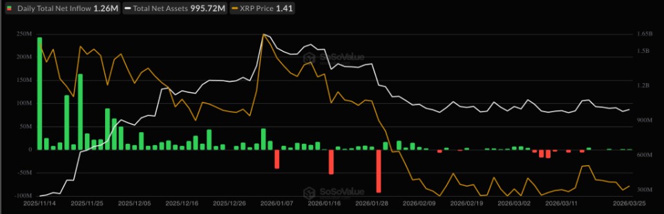 管理资产总额在今年1月初一度攀升至16.5亿美元,现已回落至约995亿美元,主要受xrp价格回落及持续资金净流出影响,相关数据来自sosovalue。
