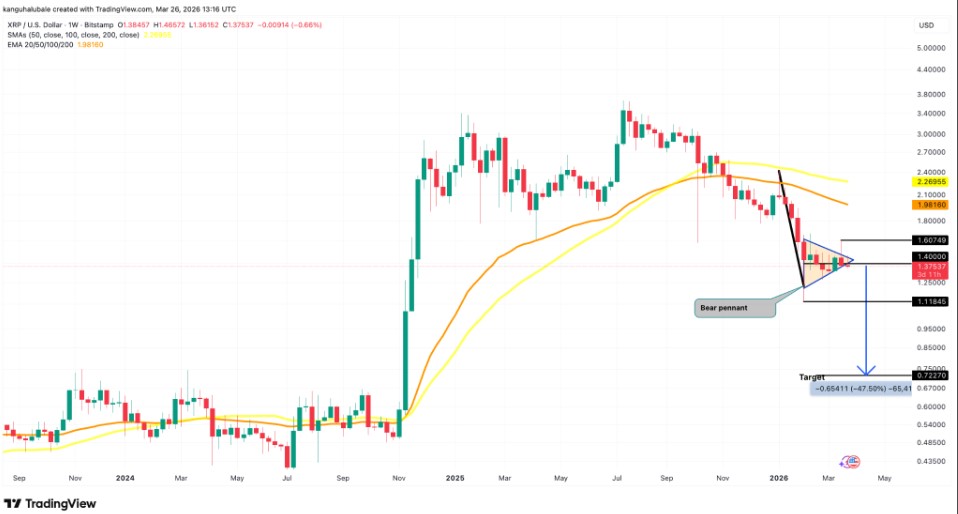 以xrp为例,该看跌旗形的对应测算目标为0.72美元,较现价低约48%。