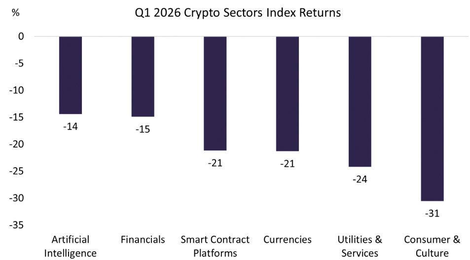 grayscale发布的2026年一季度报告进一步印证了这一观点,显示人工智能板块在今年前三个月录得14%的最小跌幅,而消费与文化为31%、智能合约平台为21%、加密货币为21%。