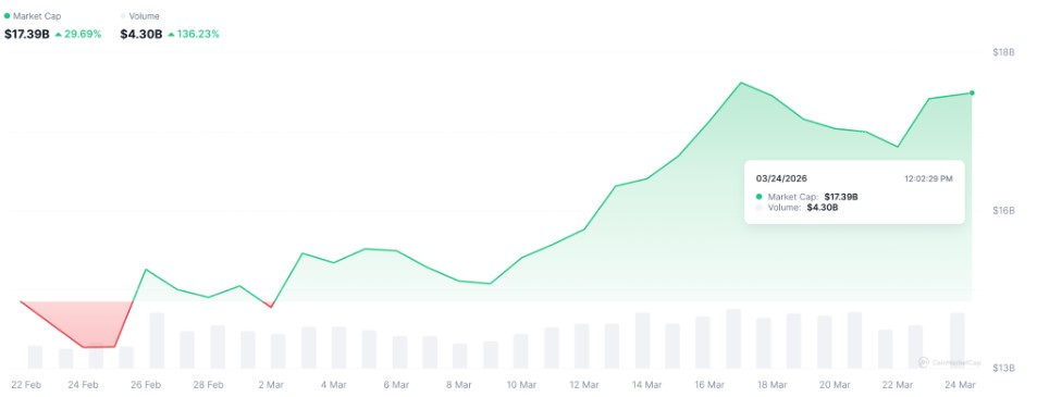 当前ai代币市值达到174亿美元,过去30天上涨30%。bittensor(tao)和near protocol(near)领衔,其中tao同期上涨75%,near上涨30%。