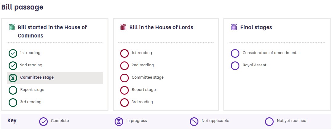 该立法目前处于下议院委员会阶段。该法案需同时通过下议院和上议院,然后获得查理三世国王的御准才能成为法律。