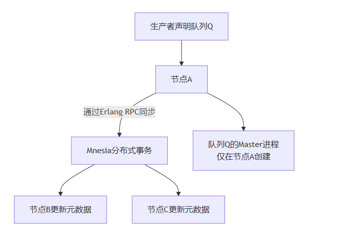 图示:声明队列时,其元数据(定义)在集群内强一致同步,但承载消息的master队列进程只在一个节点创建。*