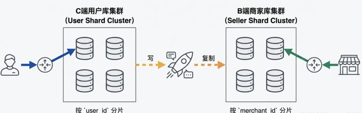 - 同步机制:用户下单写入“用户库”成功后,异步把数据同步一份到“商家库”。