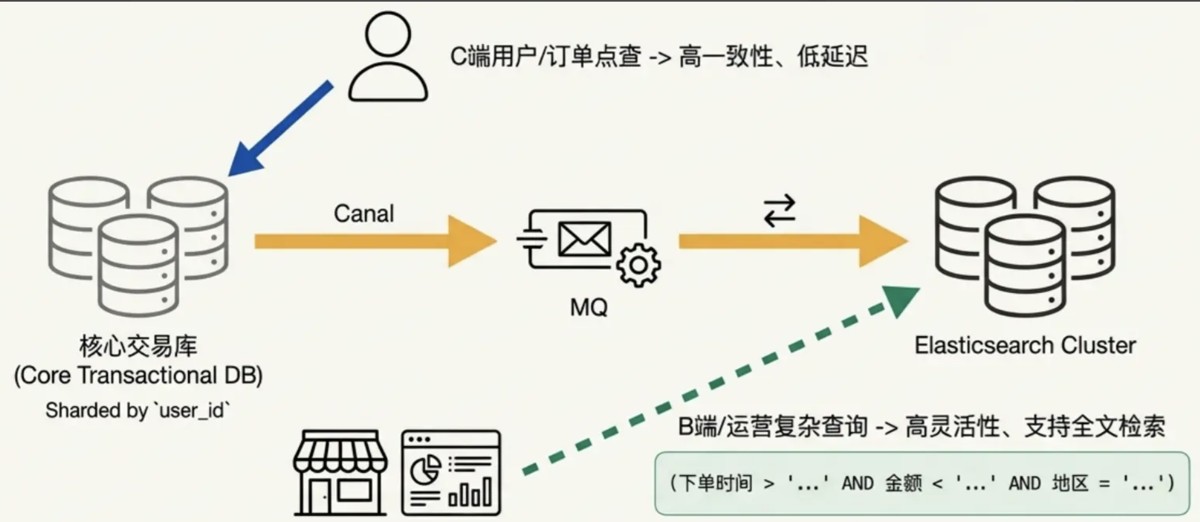 - 商家查询、运营后台查询、复杂报表,全部走 es。