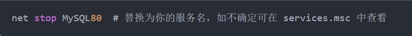 方法 1(图形化):按 win+r 输入 services.msc → 找到 mysql 服务(如 mysql80)→ 右键「停止」。